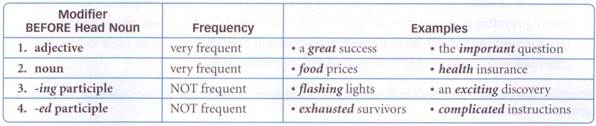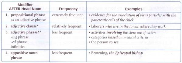 Frequency information. There are four main types of modifier that occur AFTER the head noun in writing.
